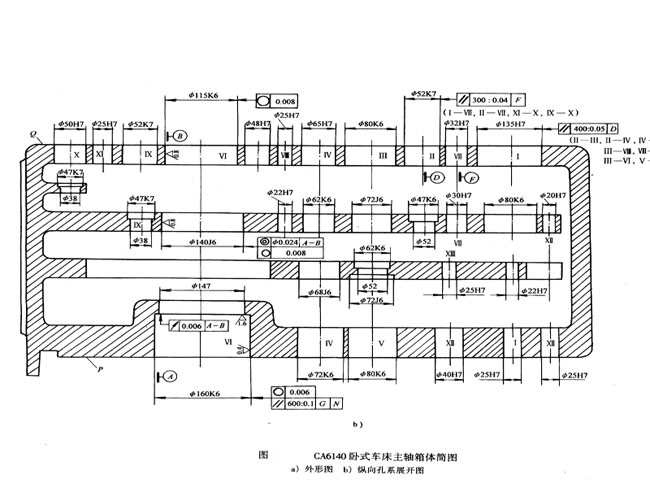 現(xiàn)以車床主軸箱箱體為例,進一步說明這些原則的具體應(yīng)用。CA6140車床主軸箱箱體零件簡圖如圖所示