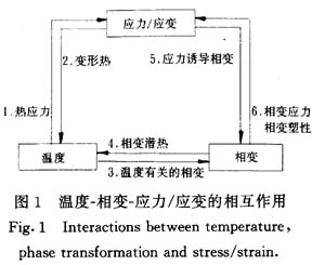 鋼在淬火過程中存在極為復(fù)雜的溫度、相變、應(yīng)力/應(yīng)變相互作用,在此方面已有許多報道[1]。如圖1所示,在淬火過程中,溫度造成熱應(yīng)力并影響材料的力學(xué)參數(shù)(彈性模量、泊松比、屈服強度和應(yīng)變硬化率等),從而影響材料的力學(xué)行為。應(yīng)力/應(yīng)變則以變形熱的形式反過來影響溫度的變化。隨著溫度的降低,在達到相變條件后將發(fā)生相變。溫度是決定相變的因素之一,但其本身又受著相變潛熱的影響。內(nèi)應(yīng)力的存在,可通過一種通常稱為應(yīng)力誘導(dǎo)相變的機制而影響相變的進程。在相變過程中,各組成相的比容差異將造成相變應(yīng)力,同時由于材料的絕大多數(shù)參數(shù)除了依賴于溫度實際上也依賴于相態(tài),因此,相變也會對材料的力學(xué)行為產(chǎn)生影響。此外,在有內(nèi)應(yīng)力存在時相變過程中還會伴隨一種“反!钡乃苄孕袨椋床牧显趹(yīng)力低于屈服強度的情況下就可以發(fā)生不可逆變形的現(xiàn)象,稱為相變塑性。