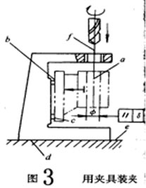 夾具是按照被加工工序要求專門設(shè)計的,夾具的定位元件能使工件相對于機床與刀具迅速占有正確位置,不需找正就能保證工件的裝夾定位精度,如圖3報增在一支架上鉆孔a,孔a與支架底面b的平行底要求是由夾具鉆套孔軸線于夾具定位元件c平面的距離決定的。