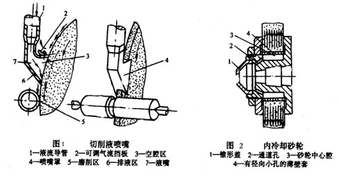 5) 改善切削液供給方式。高速磨削時,磨削溫度極高,面砂輪周圍高速回轉(zhuǎn)形成一股強(qiáng)大的氣流,切削液不易注入磨削區(qū),為避免工件表面燒傷,應(yīng)增加切削液的流量和壓力,并采用特殊噴嘴,如圖1所示,另外還可采用多孔性砂輪,冷卻液不是直執(zhí)著注入磨削區(qū),而是從砂輪內(nèi)部在離心力作用下送入磨削區(qū),如圖2