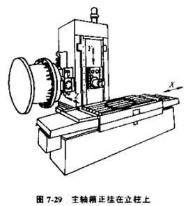 1)刨臺型,床身呈T字形,工作臺在前床身上作X向運動,立柱在后床身上作Z向運動。主軸箱在立柱上有正掛(圖7-29)、側(cè)掛兩種形式,作Y向運動。適用于中、大型零件,特別是長度較大零件的鏜、銑等多工序加工。