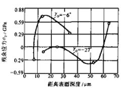1) 刀具方面,當(dāng)前角由正值逐漸變?yōu)樨?fù)值時(shí),表層的殘余拉應(yīng)力逐漸減小,但殘余應(yīng)力層的深度增大(見圖3-5)在一定的切削用量下,采用絕對(duì)值較大的負(fù)前角,可使已加工表面層得到殘余壓應(yīng)力(見圖3-6)