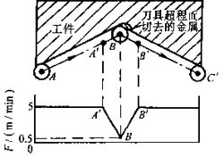 在輪廓加工中,應(yīng)注意克服由于慣性或伺服系統(tǒng)的隨動(dòng)誤差而造成輪廓拐角處的“超程”或“欠程”現(xiàn)象。為此,要選擇變化的進(jìn)給量,即在接近拐角處應(yīng)適當(dāng)降低進(jìn)給量,過拐角后在逐漸升高,以保證加工精度(見圖4-5)。