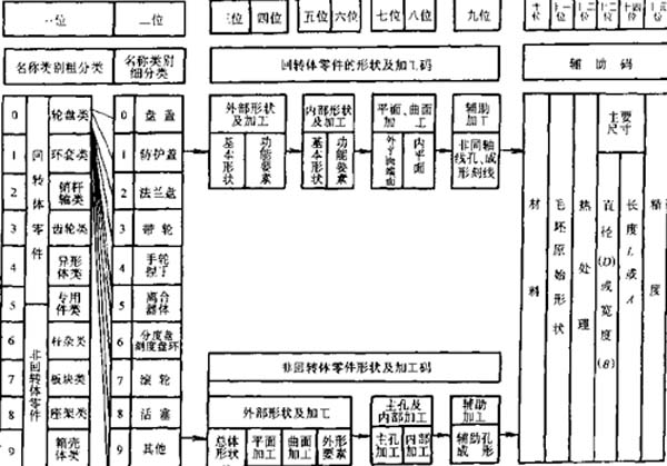 (1)機械零件分類編碼JLBM-1系統(tǒng)JLBM-1分類編碼系統(tǒng)是我國原機械工業(yè)部指定的一套通用零件分類編碼系統(tǒng)(JB/Z251—85),它適用于中等及中等以上規(guī)模的多品種、中小批量生產的機械加工工廠,是這個些工廠在設計、制造工藝和生產管理等方面實施成組技術的一種指導性文件。