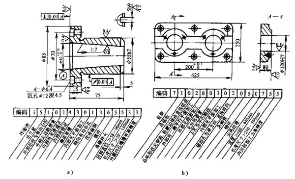 JLBM-1編碼系統(tǒng)由15個碼位組成(見圖5-3),其中主碼9位,輔碼6位。主碼的第一、第二位為名稱類別矩陣,主要反映零件的功能和主要結構,第三至第九位表示零件在形狀與加工方面的各種特征。6位輔碼則分別代表零件的材料、毛坯、熱處理、主要尺寸和精度等有關信息。每一碼位包括0~9的十個特征項。JLBM-1為混合式結構,名稱類別分回轉件和非回轉件兩大類,各自成樹狀結構,各類的第三至第九位碼分別成鏈式結構,輔碼也是鏈式結構。JLBM-1系統(tǒng)的特點是零件類別按名稱類別矩陣劃分,便于設計、檢索;分類表簡單,定義明確,容易掌握;碼位適中,又有足夠的信息容量。圖5-4表示了回轉體和非回轉體零件用該分類編碼系統(tǒng)進行編碼的示例。