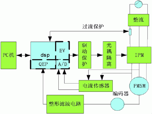 交流伺服數(shù)字化系統(tǒng)的硬件由DSP作為信號(hào)處理器,用旋轉(zhuǎn)編碼器和電流傳感器提供反饋信號(hào),智能功率模塊IPM作為逆變器,經(jīng)傳感器出來的信號(hào)經(jīng)過濾波整形等處理后反饋給DSP進(jìn)行運(yùn)算,DSP經(jīng)過對(duì)參考信號(hào)和反饋信號(hào)的處理運(yùn)算來調(diào)節(jié)伺服系統(tǒng)的電流環(huán),速度環(huán),和位置環(huán)的控制,最后輸出PWM信號(hào)經(jīng)過隔離驅(qū)動(dòng)IPM模塊實(shí)現(xiàn)電機(jī)的伺服閉環(huán)控制。 系統(tǒng)的硬件結(jié)構(gòu)如圖1所示。