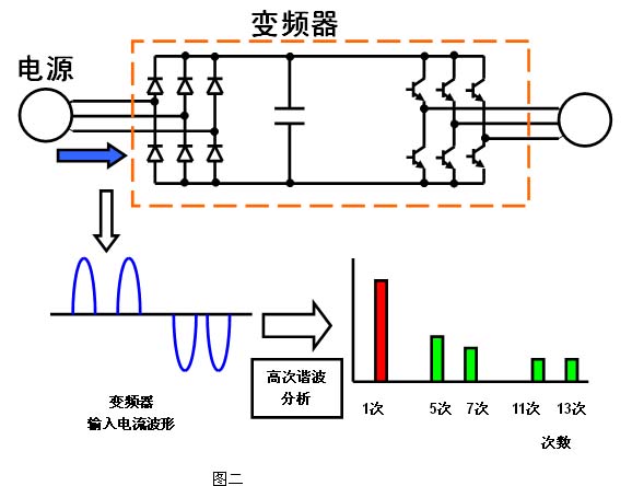 電磁干擾也稱電磁騷擾(EMI),是以外部噪聲和無用信號(hào)在接收中所造成的電磁干擾,通常是通過電路傳導(dǎo)和以場的形式傳播的。變頻器的整流橋?qū)﹄娋W(wǎng)來說是非線性負(fù)載,它所產(chǎn)生的諧波會(huì)對(duì)同一電網(wǎng)的其他電子、電氣設(shè)備產(chǎn)生諧波干擾。如下圖一所示: