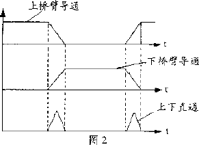在小車動(dòng)作的過程中,我們要不斷 地使電機(jī)在四個(gè)象限之間切換,即在正 轉(zhuǎn)和反轉(zhuǎn)之間切換,也就是在S1、S2導(dǎo)通且S3、S4關(guān)斷,到S1、S2關(guān)斷且S3、 S4導(dǎo)通,這兩種狀態(tài)之間轉(zhuǎn)換。在這種 情況下,理論上要求兩組控制信號(hào)完全互補(bǔ),但是,由于實(shí)際的開關(guān)器件都存在 開通和關(guān)斷時(shí)間,絕對(duì)的互補(bǔ)控制邏輯 必然導(dǎo)致上下橋臂直通短路,比如在上橋臂關(guān)斷的過程中,下橋臂導(dǎo)通了。這個(gè)過程可用圖2說明。