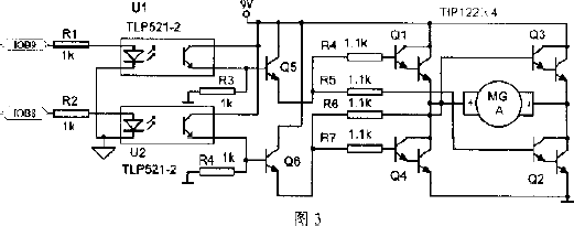 由于電機(jī)在正常工作時(shí)對(duì)電源的干擾很大,如果只用一組電源時(shí)會(huì)影響單片機(jī)的正常工作,所以我們選用雙電源供電。一組5V給單片機(jī)和控制電路供電,另外一組9V給電機(jī)供電。在控制部分和電機(jī)驅(qū)動(dòng)部分之間用光耦隔開,以免影響控制部分電源的品質(zhì),并在達(dá)林頓管的基極加三極管驅(qū)動(dòng),可以給達(dá)林頓管提供足夠大的基極電流。圖3所示為采用TIP122的驅(qū)動(dòng)電機(jī)電路,IOB8口為“0”,IOB9口輸入PWM波時(shí),電機(jī)正轉(zhuǎn),通過改變PWM的占空比可以調(diào)節(jié)電機(jī)的速度。而當(dāng)IOB9口為“0”,IOB8口輸入PWM 波時(shí),電機(jī)反轉(zhuǎn),同樣通過改變PWM的占空比來調(diào)節(jié)電機(jī)的速度。