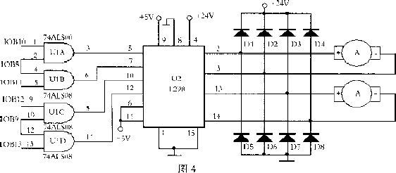 圖4為采用內(nèi)部集成有兩個(gè)橋式電路的專用芯片L298所組成的電機(jī)驅(qū)動(dòng)電路。驅(qū)動(dòng)芯片L298是驅(qū)動(dòng)二相和四相步進(jìn)電機(jī)的專用芯片,我們利用它內(nèi)部的橋式電路來驅(qū)動(dòng)直流電機(jī),這種方法有一系列的優(yōu)點(diǎn)。每一組PWM波用來控制一個(gè)電機(jī)的速度,而另外兩個(gè)I/O口可以控制電機(jī)的正反轉(zhuǎn),控制比較簡單,電路也很簡單,一個(gè)芯片內(nèi)包含有8個(gè)功率管,這樣簡化了電路的復(fù)雜性,如圖所示IOB10、IOB11控制第一個(gè)電機(jī)的方向,IOB8輸入的PWM控制第一個(gè)電機(jī)的速度;IOB12、IOB13控制第二個(gè)電機(jī)的方向,IOB9輸入的PWM控制第二個(gè)電機(jī)的速度。