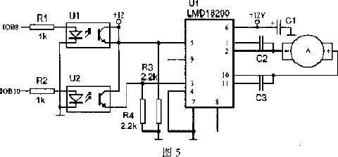 LMD18200是美國國家半導(dǎo)體公司推出的專用于直流電動(dòng)機(jī)驅(qū)動(dòng)的H橋組件,同一芯片上集成有CMOS控制電路和DMOS功率器件。此種芯片瞬間驅(qū)動(dòng)電流可達(dá)6A,正常工作電流可達(dá)3A,具有很強(qiáng)的驅(qū)動(dòng)能力,無“shot-through”電流,而且此種芯片內(nèi)部還具有過流保護(hù)的測(cè)量電路,只需要在 LMD18200的8腳輸出端測(cè)出電壓和給定的電壓比較即可保護(hù)電路過流,從而實(shí)現(xiàn)電路的過流保護(hù)功能。由LMD18200組成的電機(jī)驅(qū)動(dòng)電路如圖5所示。LMD18200的5腳為PWM 波輸入端,通過改變PWM的占空比就可調(diào)節(jié)電機(jī)的速度,改變3腳的高低電平即可控制電機(jī)的正反轉(zhuǎn)。此電路和以上幾種驅(qū)動(dòng)電路比較具有明顯的優(yōu)點(diǎn),驅(qū)動(dòng)功率大,穩(wěn)定性好,實(shí)現(xiàn)方便,安全可靠。