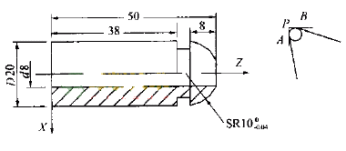 調用刀具半徑補償指令,特別注意以A、B點對刀后要找出正確的刀尖圓心位置。在刀補建立時,要使刀尖圓弧圓心沿工件待加工輪廓表面(編程軌跡)運動,而車刀不是回轉類刀具,傳統(tǒng)的車削加工基本不涉及刀尖圓心的問題,故須對車削數(shù)控系統(tǒng)的刀具半徑補償有本質的認識。