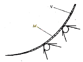 誤差分析在數(shù)控車床使用過程中,為了降低被加工工件表面的粗糙度,減緩刀具磨損,提高刀具壽命,通常將車刀刀尖刃磨成圓弧,圓弧半徑一般在0.4~1.6mm之間。如圖1所示,采用試切法對刀時由A、B兩點分別確定刀架中心的X、Z位置。這樣,加工程序所描述的刀位點是P點,數(shù)控系統(tǒng)將控制P點的運動軌跡,而在切削時實際起作用的切削刃則是刀尖圓弧上的各切點,這勢必會產生加工表面的形狀誤差。在車削外圓、內孔及端面時,這個誤差為零。而在加工弧面和錐面時,這個誤差就很明顯。圖1零件SR10-0.04球面加工的誤差分析見圖2。圖中M線為加工程序所描述的P 的軌跡,即工件的理想尺寸,而實際加工后的輪廓是N線,陰影就是少切削部分,即加工誤差。假設刀尖圓弧半徑為r=0.4mm,理論分析表明,N線是半徑為R-r=9.6的圓弧,M、N兩圓弧圓心X、Z向均相距r=0.4mm,最大誤差約為0.17mm,不滿足精度要求。