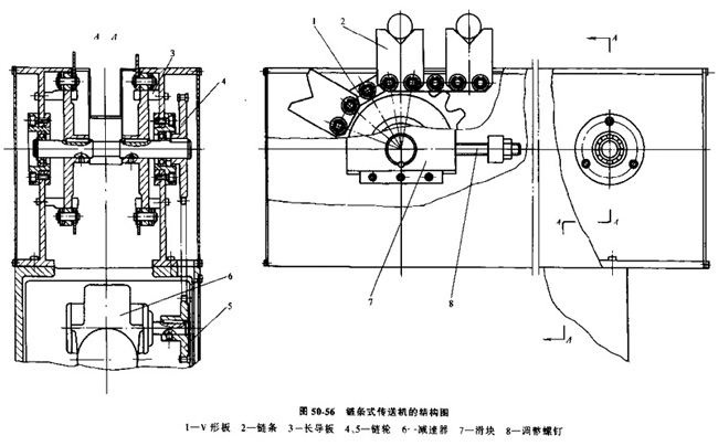 如圖50-56所式,它由兩列封閉式鏈條、鏈輪和驅(qū)動(dòng)裝置所組成。用于支承工件及定位的V形板1,等距地固定在鏈條2的削軸上,隨同鏈條一起運(yùn)動(dòng)。鏈條由電動(dòng)機(jī)通過減速器6和鏈輪5、4傳動(dòng),為了防止鏈條下垂,每個(gè)環(huán)節(jié)側(cè)面的滾子支承在導(dǎo)板3上,在減速器軸端裝有電磁離合器。用來實(shí)現(xiàn)鏈條的準(zhǔn)確停止。鏈條的松緊可以通過螺釘8和滑塊7調(diào)節(jié)。