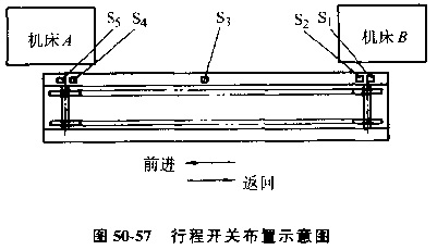 為了控制不同的工作過程,在料道上裝有五個(gè)行程開關(guān),由工件在行程開關(guān)上發(fā)出信號,見圖50-57。其控制過程為:
