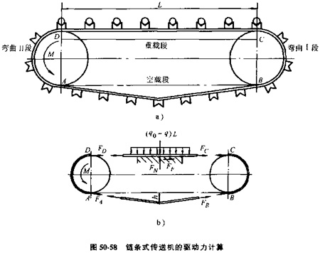 鏈條式傳誦機(jī)的驅(qū)動(dòng)力F和驅(qū)動(dòng)力距M,可參照鏈條運(yùn)輸機(jī)的受力分析方法計(jì)算,見圖50-58。
