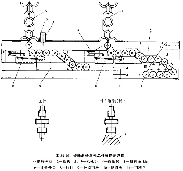 圖50-60是由鏈板履帶傳送機(jī)組成的齒輪加工單元,工件安裝在隨行托板中,在鏈板履帶上輸送,箭頭A表示工件傳送方向,工件從通道Ⅰ輸入,經(jīng)分路擋板2分成兩路。一路沿通道Ⅱ進(jìn)入第一臺滾齒機(jī)貯料區(qū),另一路沿通道Ⅲ經(jīng)分路擋板9進(jìn)入第二臺滾齒機(jī)貯料區(qū)。上料時(shí),液壓缸4動(dòng)作,通過杠桿機(jī)構(gòu)8使撥料板10及擋料爪11動(dòng)作,撥料塊將工件撥至機(jī)械手3前,擋料爪則將通道Ⅱ繼續(xù)送來的工件擋住,加工好的工件由通道Ⅰ輸出。