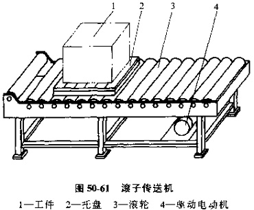 滾子傳送機(jī)是由一根根平行的轉(zhuǎn)軸。及轉(zhuǎn)軸上套的滾輪,鏈輪(或齒輪)及驅(qū)動(dòng)裝置組成的。見圖50-61/滾輪安裝成等高,靠滾動(dòng)摩擦力傳送工件。