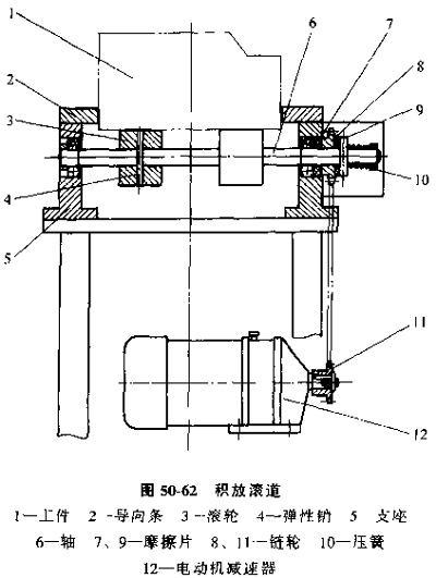 當(dāng)轉(zhuǎn)軸與鏈輪、滾輪均采用剛性聯(lián)接時(shí),傳送機(jī)屬于強(qiáng)制滾輪,即不論工件處于什么狀態(tài),在電動(dòng)機(jī)運(yùn)轉(zhuǎn)情況下,滾輪始終勻速轉(zhuǎn)動(dòng),此時(shí)如果工件被擋料器阻擋停下,滾輪與工件輸送面之間的滾動(dòng)摩擦變?yōu)榛瑒?dòng)摩擦,會(huì)加大輸送面的磨損,這時(shí)對一些材質(zhì)較軟。用已精加工面作輸送面,或?qū)斔兔婢纫蟾叩墓ぜ螂S行夾具來說是不利的,因此,現(xiàn)在多采用積放式滾子傳送機(jī),也就是滾輪與轉(zhuǎn)軸之間,或轉(zhuǎn)軸與鏈輪之間,不采用剛性聯(lián)接,而是靠摩擦傳動(dòng),見圖50-62。當(dāng)正常輸送時(shí),驅(qū)動(dòng)力通過鏈條、鏈輪、滾輪、驅(qū)動(dòng)工件,工件與滾輪間為純滾動(dòng),當(dāng)工件被擋住時(shí),滾輪與轉(zhuǎn)軸或轉(zhuǎn)軸與鏈輪之間的摩擦力小于工件與滾輪間的靜摩擦,工件與滾輪保持靜止,而滾輪與轉(zhuǎn)軸,或轉(zhuǎn)軸與鏈輪之間相對打滑,從而減少了對工件輸送面的磨損。采用滾輪與轉(zhuǎn)軸相對摩擦傳動(dòng)的方式,結(jié)構(gòu)相對簡單。但滾輪與轉(zhuǎn)軸間磨損較快,對輸送精度和維修更換不利。采用鏈輪端面摩擦方式,可以通過彈簧調(diào)整摩擦力。較少摩擦片磨損的影響。維修更換都比較方便,但軸向尺寸需要加大。