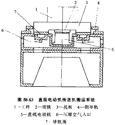 圖50-63是用于組成柔性制造系統(tǒng)的直線電動(dòng)機(jī)傳送機(jī),在這一輸送系統(tǒng)中,托盤在空氣靜壓導(dǎo)軌上運(yùn)行,直線電動(dòng)機(jī)設(shè)置在中部,銜鐵設(shè)置在托板下方。