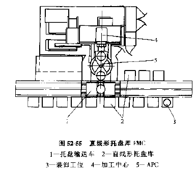 3) 直線形托板庫FMC,如圖52-55所示。相當(dāng)于上述的圓形托板庫展成直線形,托板輸送裝置常為有軌小車,這種單元的優(yōu)點是具有擴展性,需要時可增加加工設(shè)備,加長運輸軌道和托板庫,擴展成更大的FMC或其他柔性制造系統(tǒng)。