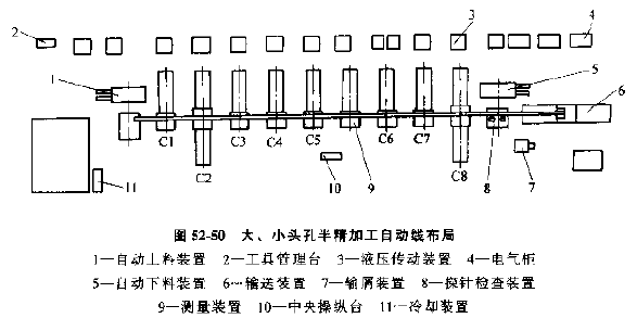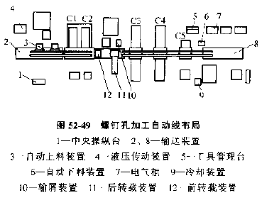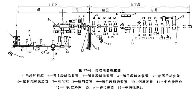 自動線總布局見圖52-48,圖52-49、圖52-50,三條自動線由20臺機(jī)床組成,每條自動線都有單獨的自動上下料裝置。
