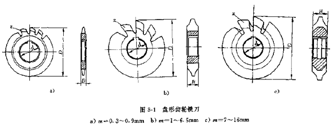 2.盤形齒輪銑刀。GB9063—88標準盤形齒輪銑刀適用于加工基準齒形角為20°、模數(shù)0.3~16mm的直齒漸開線圓柱齒輪,如圖3-1所示,其采用徑向鏟齒,刀具前角為零度,表3-45給出了盤形齒輪銑刀的基本尺寸。