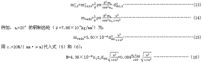 對圓柱齒輪,采用co′=14N/( mm·μm)。對圓柱斜齒輪的研究表明,螺旋 角增加時,齒的剛度降低。另一方面,錐齒輪的輪齒在錐體上的螺旋形布置加強(qiáng)了斜齒、弧齒錐齒輪的剛度。由于缺乏更深入的了解,在平均條件下(FmtKA/bc≥100N/mm,與bc/b≥0.85),圓柱直齒輪的剛度對錐齒輪是適用的。因此,c′能按下式確定: