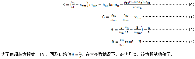 為了計(jì)算齒根危險(xiǎn)截面弦齒厚SFn和彎曲力臂hFa,首先要確定輔助值E、G、H和θ: