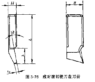 成對滾切銑刀盤切齒時,兩把銑刀盤在工件的同一齒槽內(nèi)工作,一把切削左齒面,另一把切削右齒面,切齒時有展成運動,銑刀盤工作側(cè)刃與銑刀端面之間通常作出一個角,使產(chǎn)形輪的齒面成為一個凹錐面,因此切出的齒輪齒長方向呈中鼓形,有利于嚙合,根據(jù)使用機床的不同,銑刀盤的直徑有150。270及600mm,其中以直徑為600mm的銑刀盤應(yīng)用最廣。刀齒的凹入角δ有1°30′、2°30′和5°三種,常用的成對滾切銑刀盤刀齒的尺寸見圖3-76和表3-149~表3-151。