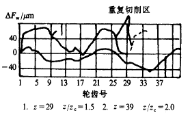 從圖2中可以看出,工件與插齒刀齒數比例關系z/zc對Fw值的影響。圖中表示出齒輪的測量結果,z=29的齒輪,在重復切削區(qū)里,公法線長度急劇變化,而z=39的齒輪未發(fā)現此情況,插齒刀齒數zc=20。