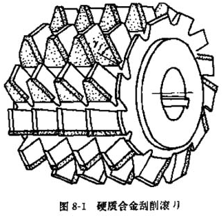 圖8-1為硬質(zhì)合金刮削滾刀,它用于精加工45~64HR的硬齒面,這種滾刀制成直槽-30°前角,刀片為YT05硬質(zhì)合金,采用真空爐焊,制造精度較高,滾刀采用端面鍵結(jié)構(gòu),孔徑較大,剛性好。以傳遞較大切削力矩和承受作用在滾刀中心方向的切削力。半精滾的滾刀容屑槽為9個(gè)左右,最終加工用滾刀的容屑槽為12個(gè)左右。