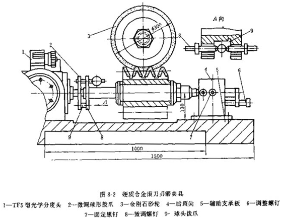 4.刃磨夾具,在M7130型機床上安裝如圖8-2所示的刃磨夾具,可刃磨模數(shù)為15~20mm的滾刀,在夾具中采用TF5型光學(xué)分度頭,其分度精度為10″,該夾具調(diào)試精度可達0.001mm,砂輪軸經(jīng)調(diào)整后,其端面圓跳動不大于3~5μm,徑向圓跳動不大于5~10μm。