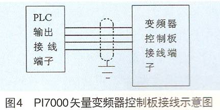 (2)元器件的選擇。根據(jù)三相異步電動機的功率為90kW,額定電流為340A,額定電壓為220V,額定頻率為37.5Hz,最高頻率140Hz,固選逆變器件IGBT為1200A/600V,儲能電解電容為6個4700μF/450V,并聯(lián)在高壓直流母線兩端,保險為600A;每個IGBT的PN端并聯(lián)兩個3μF/600A的吸收電容。 4.3 PI7000矢量變頻器控制板接線示意圖及其說明 控制過程說明:司機腳踩油門、換檔、腳剎、倒車等的操作的狀態(tài),其所對應的數(shù)字或模擬信號傳送到PLC中,PLC通過程序處理,再將所需信號傳送到變頻器的控制板的接線端子,對變頻器進行自動控制,變頻器按照所設定的功能參數(shù)實現(xiàn)相應的功能。變頻器采用矢量轉矩控制,滿足汽車系統(tǒng)的低頻大轉矩輸出、高速動態(tài)特性,使三相異步電動機帶動輪軸快速、平滑的起動、運行、停止(沒有沖擊力),半坡起動力矩可以達到200%,達到混合動力電動汽車的設計要求,如圖4所示。