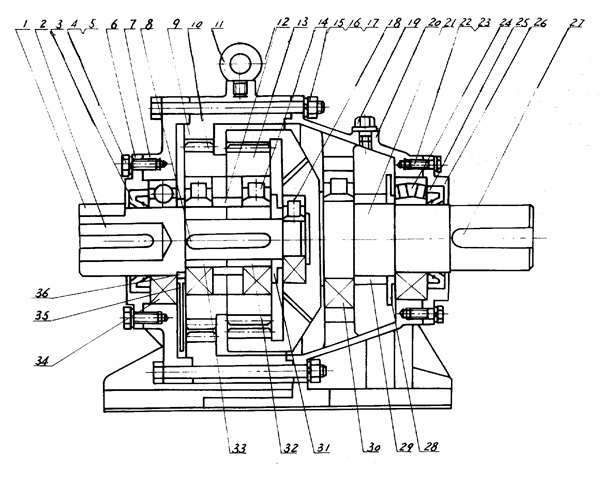 | 一種減速機(jī),它主要包括輸入軸、輸出軸、傳動(dòng)齒輪、軸承和外殼構(gòu)成,輸入軸通過(guò)鍵連接齒輪,最后齒輪再通過(guò)輸出軸,其特征在于它還包括固定齒輪、偏心套、行星齒輪、凸凹?jí)K和螺栓構(gòu)成; 輸入軸(2)經(jīng)過(guò)偏心套(33)通過(guò)軸承(14)與輸入行星齒輪(10)連接,輸入軸2上的行星齒輪(10)圍繞殼體(9)上固定齒輪部分旋轉(zhuǎn),而殼體(9)與端蓋(7)、(20)經(jīng)過(guò)螺栓(15)連接固定;輸入軸(2)上的行星齒輪(10)與行星齒輪(13)通過(guò)之間凸凹?jí)K鑲?cè)脒B接同步運(yùn)轉(zhuǎn),行星齒輪(13)再與輸出軸(21)齒輪部分嚙合連接。 輸入軸(2)由軸承(34)、軸承(18)支承,而軸承(18)裝在輸出軸(21)的中心線上,軸承(34)裝在端蓋(7)上,輸出軸(21)由軸承(30)和軸承(24)支承,軸承(30)和(24)安裝在端蓋(20)上,端蓋(7)、(20)通過(guò)各自止口定位與殼體(9)用螺栓(15)固定。 |