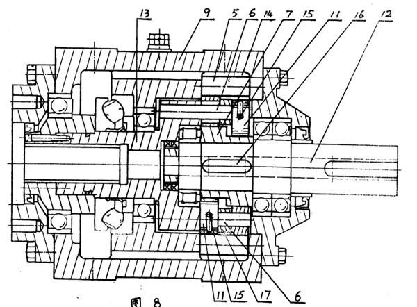 一種滾齒減速機,由偏心輪激波器驅(qū)動作為行星輪構件的內(nèi)齒輪,使其和外環(huán)固定的針齒依序嚙合,其特征在于內(nèi)齒輪為由多個能自由滾動的圓柱滾筒形滾齒11環(huán)繞排列于激波器之偏心輪外周而構成的滾齒齒輪,各滾齒11內(nèi)有與輸出軸13連接的輸出軸銷6,外以托環(huán)15托住。