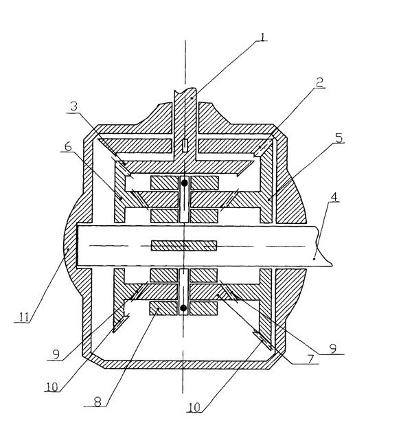 | 本發(fā)明涉及機(jī)械傳動(dòng)裝置,具體地說(shuō)是以非等速運(yùn)動(dòng)的速度差完成力的傳遞,并具有大傳動(dòng)比的速差減速機(jī)。速差減速機(jī)設(shè)有相互垂直設(shè)置的主動(dòng)軸(1)和從動(dòng)軸(4)、第1主動(dòng)錐齒(2)和第2主動(dòng)錐齒(3),從動(dòng)軸(4)上滑動(dòng)套大雙錐齒滑動(dòng)齒輪(5)和小雙錐齒滑動(dòng)齒輪(6),大雙錐齒滑動(dòng)齒輪(5)和小雙錐齒滑動(dòng)的內(nèi)齒圈(9)之間設(shè)有行星齒輪(7)同時(shí)與兩側(cè)內(nèi)齒圈(9)嚙合,所述行星齒輪輪輻(8)與從動(dòng)軸(4)傳動(dòng)連接。由于兩個(gè)雙錐齒滑動(dòng)齒輪因不同徑而產(chǎn)生速度差,因而行星齒輪(7)同時(shí)受兩個(gè)雙錐齒滑動(dòng)齒輪異向驅(qū)動(dòng)力和速差平衡驅(qū)動(dòng)力的作用。通過(guò)調(diào)節(jié)兩個(gè)雙錐齒滑動(dòng)齒輪的直徑差,就可以得到所需的傳動(dòng)比,傳動(dòng)比可達(dá)數(shù)千至數(shù)萬(wàn)。另外速差減速機(jī)的結(jié)構(gòu)非常簡(jiǎn)潔、緊湊,因此,體積相對(duì)較小。 |