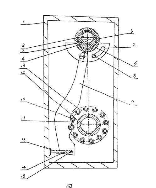 | 一種減速機,包括輸入軸、主動輪、被動輪、輸出軸、殼體,其特征是上述所述的主動輪是有3至10個偏心輪(4)組成,每個偏心輪(4)內(nèi)孔固定在所述的輸入軸(2)上,每個偏心輪(4)外園上設(shè)置外套(32),每個外套(32)上分別連接連桿(27)位于殼體(1)內(nèi)一側(cè),每個連桿(27)連接能與滾輪(13)邊緣上的滾子輪(10)嚙合的鉤齒板(16);在工作時至少有1個鉤齒板(16)和滾輪(13)邊緣上的滾子輪(10)嚙合,上述所述的被動輪是邊緣上裝有滾子輪(10)的滾輪(13)固定上輸出軸(12)上,滾輪(13)邊緣上滾子輪(10)的軸向排數(shù)大于或等于鉤齒板(16)數(shù),在連桿(27)上設(shè)置有定位槽(24),固定銷(21)設(shè)置在連桿(27)定位槽(24)內(nèi)位于殼體(1)內(nèi),或者每個連桿(27)上設(shè)有能與滾輪(13)邊緣上的滾子輪(10)嚙合的鏈齒(11),在工作時至少有1個鏈齒(11)和滾輪(13)邊緣上的滾子輪(10)嚙合,鉤齒板(16)背面設(shè)置有彈性復(fù)位裝置。 |