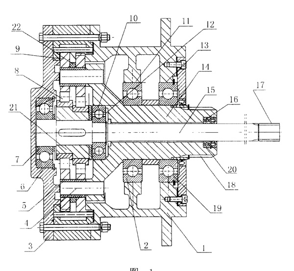 | 一種擺線針輪減速機,包括殼體(1)、端蓋(3)、輸出軸(14)、輸出軸軸承(2,19)、輸入軸(15)及輸入軸軸承(7,10,16),其特征在于:輸入軸軸承(7,10,16)分別固定在端蓋軸承室(6)及輸出軸軸承室(12,20)內(nèi),輸出軸軸承(2,19)分別固定在殼體(1)內(nèi)的軸承室(11,13)內(nèi),輸入軸(15)上固定有偏心套(21),偏心套(21)上固定兩個偏心軸承(8),兩個偏心軸承(8)上分別固定中間有間隔環(huán)(22)的擺線輪(9),擺線輪(9)上的孔內(nèi)置有銷套(5),銷套(5)內(nèi)置有一端置入輸出軸(14)上的孔內(nèi)的銷軸(4)。 |