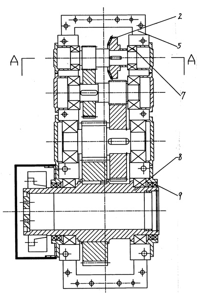 | 本實(shí)用新型提供一種保證潤(rùn)滑條件,解決潤(rùn)滑泄漏問(wèn)題的高油位自潤(rùn)滑減速機(jī),它有多級(jí)齒輪傳動(dòng),在高位的第一級(jí)傳動(dòng)中采用相互垂直的錐齒輪與錐齒軸嚙合傳動(dòng),錐齒軸的另一端為輸入端,在錐齒軸的輸入端及末級(jí)傳動(dòng)的輸出軸出軸處均采用雙油封密封,上述第一級(jí)傳動(dòng)直接浸泡在潤(rùn)滑油中,實(shí)現(xiàn)濺油潤(rùn)滑方式。由于采用了高位第一級(jí)傳動(dòng)為相互垂直的錐齒嚙合,使減速機(jī)的輸入軸與地面平行設(shè)置,同現(xiàn)有輸入軸與地面垂直設(shè)置的立式減速機(jī)相比,其輸入軸軸承位置大大降低,因此可采取濺油潤(rùn)滑方式,而取消了壓力循環(huán)潤(rùn)滑方式,這樣就省去了復(fù)雜的外部供油裝置。 |