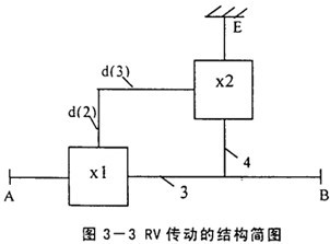 為計算RV傳動的傳動比,將上述的傳動簡圖用圖3-3所示的結(jié)構(gòu)簡圖代替。該機構(gòu)簡圖包括兩個簡單行星機構(gòu):x1和x2。輸出件A為中心輪1,輸出件B為輸出盤6,且有ω6=ω4。支承件E為針輪7,漸開線行星輪2與轉(zhuǎn)臂(曲柄軸)3均為輔助件d。