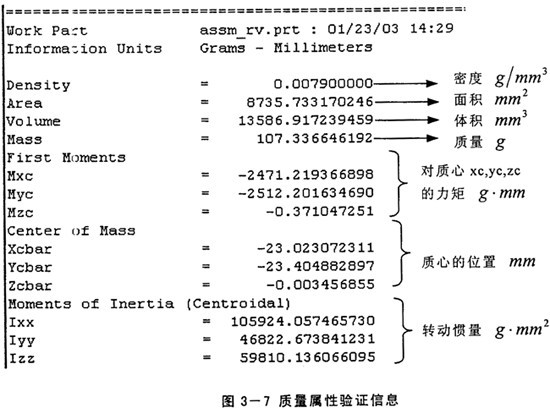 通過UG強大的質(zhì)量屬性檢驗功能,可獲得每個零件及整個模型的密度、體積、質(zhì)量和慣量等必要信息。上圖3-7是所獲得的擺線輪的相關(guān)信息。