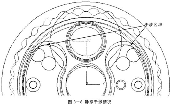 后三種都是實際結(jié)構(gòu)可能存在的,當(dāng)出現(xiàn)第一種干涉即硬干涉時就要引起高度重視,這可能是:設(shè)計存在問題,必須及時糾正。就是借助此功能,造型完成后,本人發(fā)現(xiàn)輸出盤與擺紅、輪間有硬干涉(見圖3-8),與設(shè)計此減速器的部門交換意見,原來他們在設(shè)計完后沒有發(fā)現(xiàn)此問題,等制造出成品后才發(fā)現(xiàn),便通過手工磨削將干涉部分除去。此處也充分體現(xiàn)了與傳統(tǒng)的設(shè)計方法相比,虛擬樣機技術(shù)有著不可比擬的優(yōu)越,即在制造第一臺物理樣機前就發(fā)現(xiàn)了機構(gòu)在結(jié)構(gòu)方面的缺陷。至于機構(gòu)的優(yōu)化和性能改進方面,通過后面的仿真分析更能清楚地展現(xiàn)虛擬樣機技術(shù)的優(yōu)越。