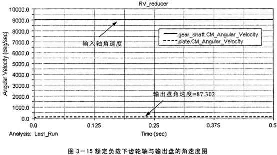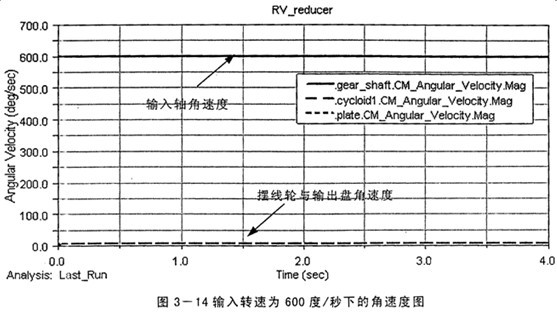 7=30,計算得到總的傳動比為103,而由仿真得到的傳動比在圖3-8中為i=3000/29.12=103.02,在圖3-9中為i=600/5.829=102.93,且圖中擺線輪與輸出盤的角速度相等說明輸出部分施加的約束滿足等角速度輸出原理。