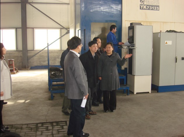 韓祝強縣長、張軍會長、劉占坤總經理在大型數控磨齒機旁