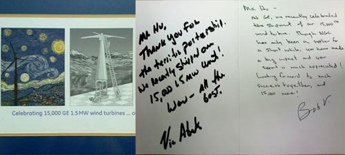 GE慶祝第15000臺1.5MW風(fēng)機(jī)時寫給南高齒董事長兼總經(jīng)理胡曰明先生的信