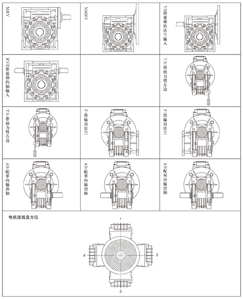 客戶根據(jù)需要,RV減速機(jī)可被配置:蝸桿尾出軸(E)、輸出法蘭(F)、扭力臂(TA)、帶延伸的法蘭輸入(YS)、蝸輪出力軸單出(AB)雙出(AS)。