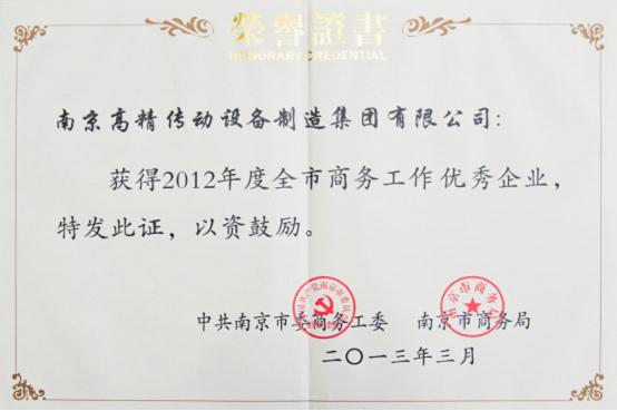 2013年3月15日,南京市政府在市級機關大禮堂召開全市商務工作會議,全面總結(jié)2012年全市商務工作,部署2013年商務工作目標任務。南京高精傳動設備制造集團有限公司(以下簡稱:南高齒)因成績突出被授予2012年度全市商貿(mào)工作優(yōu)秀企業(yè)稱號。