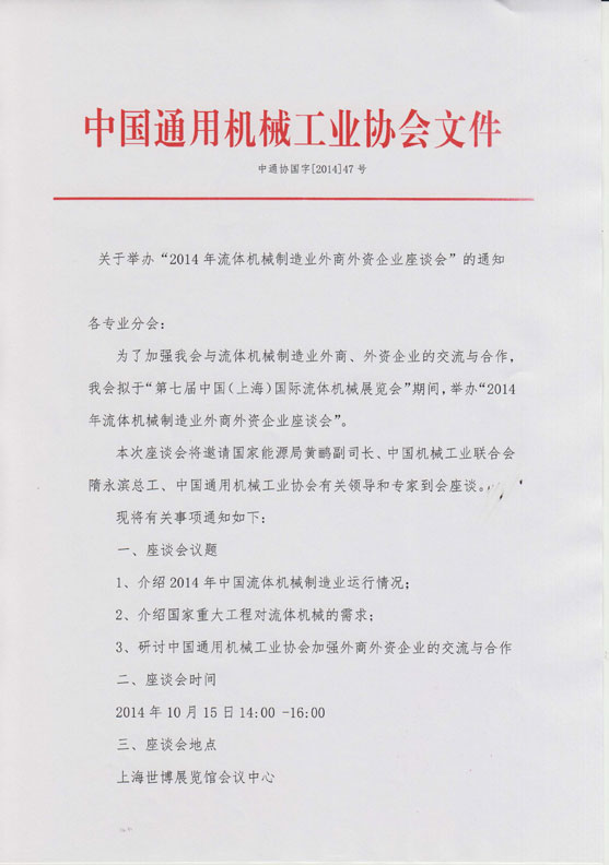 為了加強我會與流體機械制造業(yè)外商、外資企業(yè)的交流與合作,我會擬于“第七屆中國(上海)國際流體機械展覽會”期間,舉辦“2014年流體機械制造業(yè)外商外資企業(yè)座談會”。