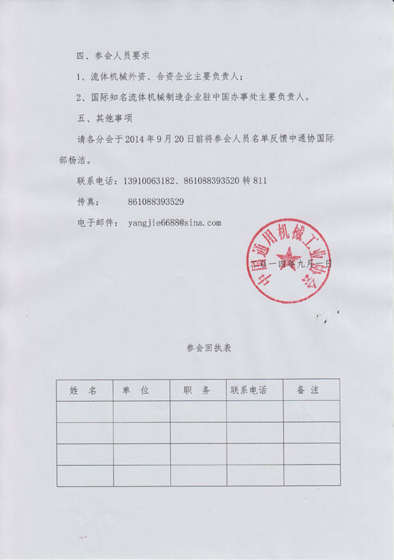 請各分會于2014年9月20日前將參會人員名單反饋中通協國際部楊潔